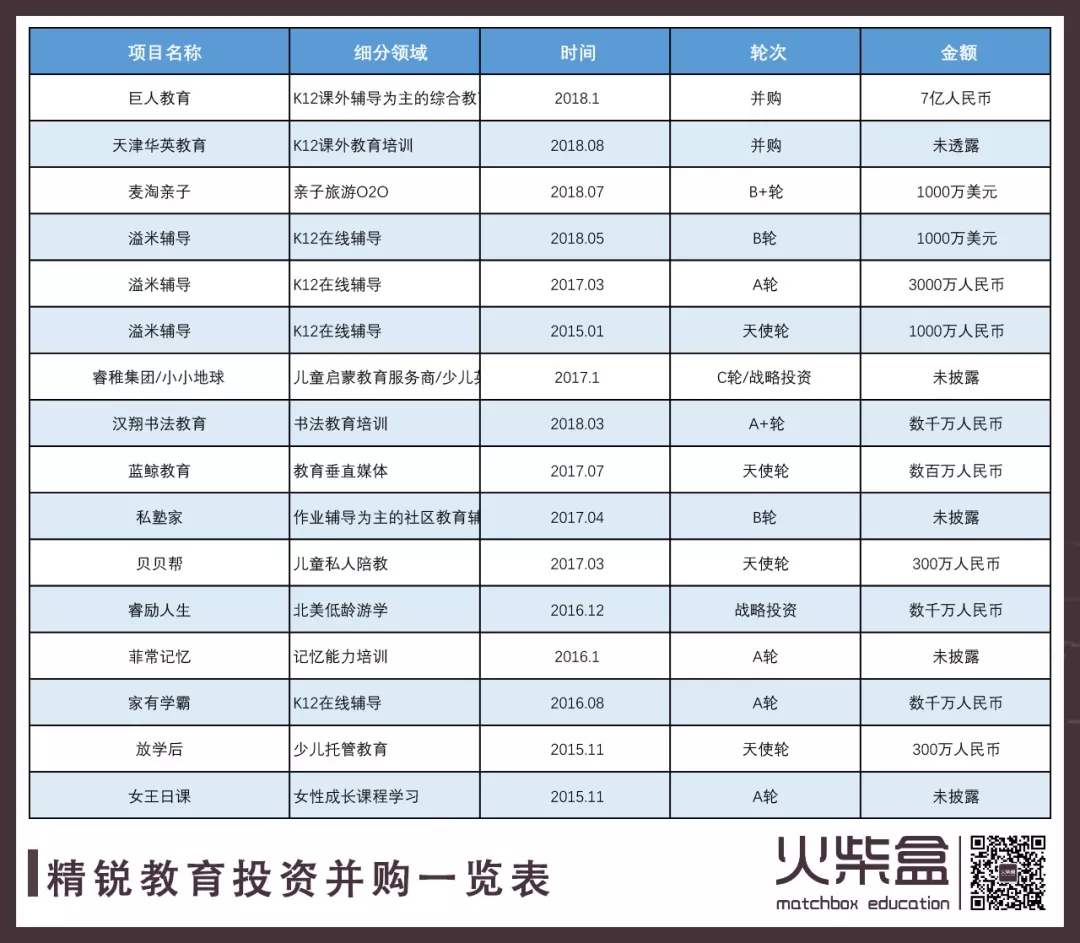 据不完全统计,精锐教育在2015-2018年间共投资了14个教育相关的项目,以早幼教和K12课外辅导为主。张熙表示,上市募集资金的用处之一就是投资并购,完善教育生态圈。