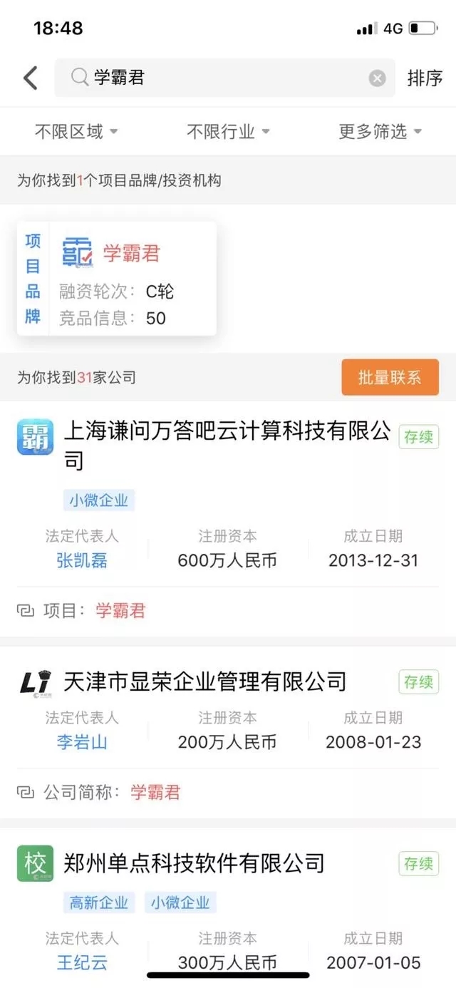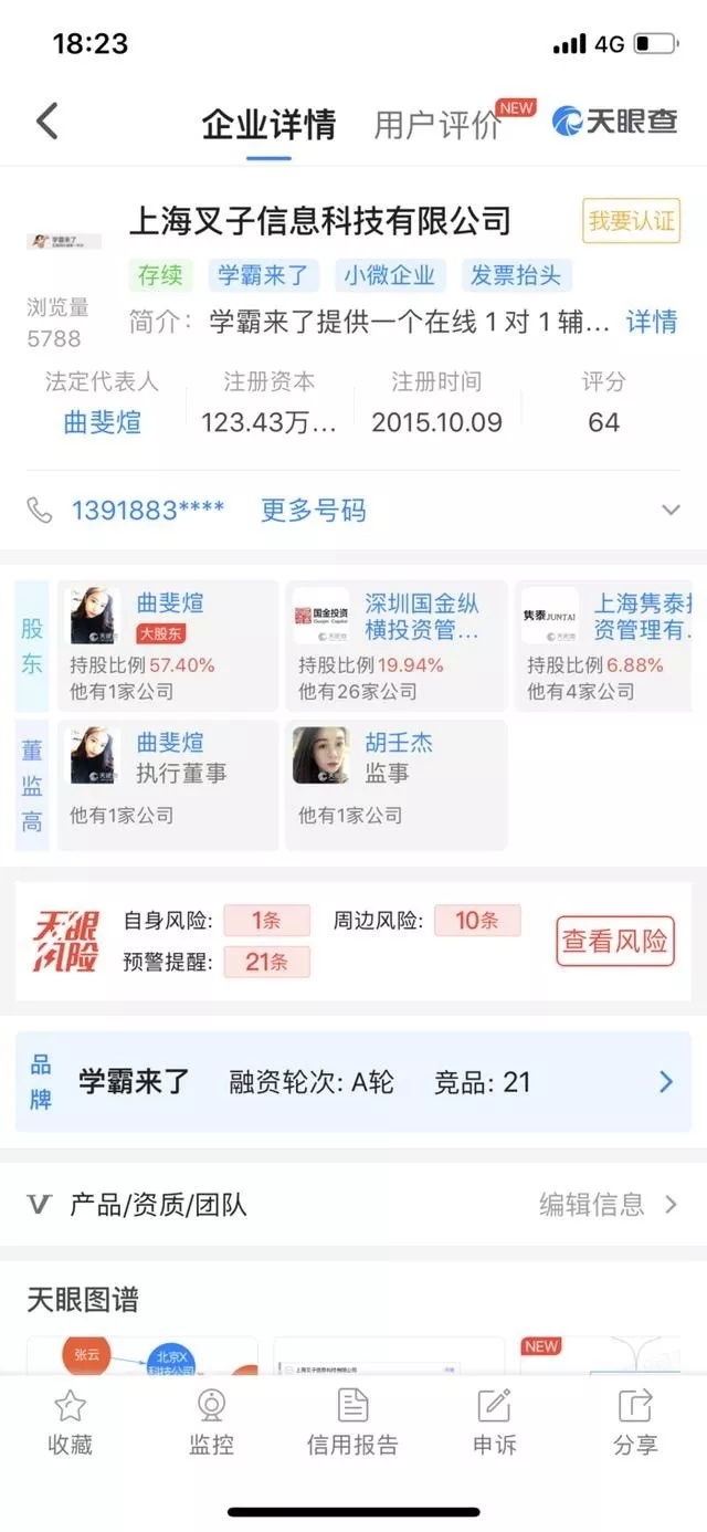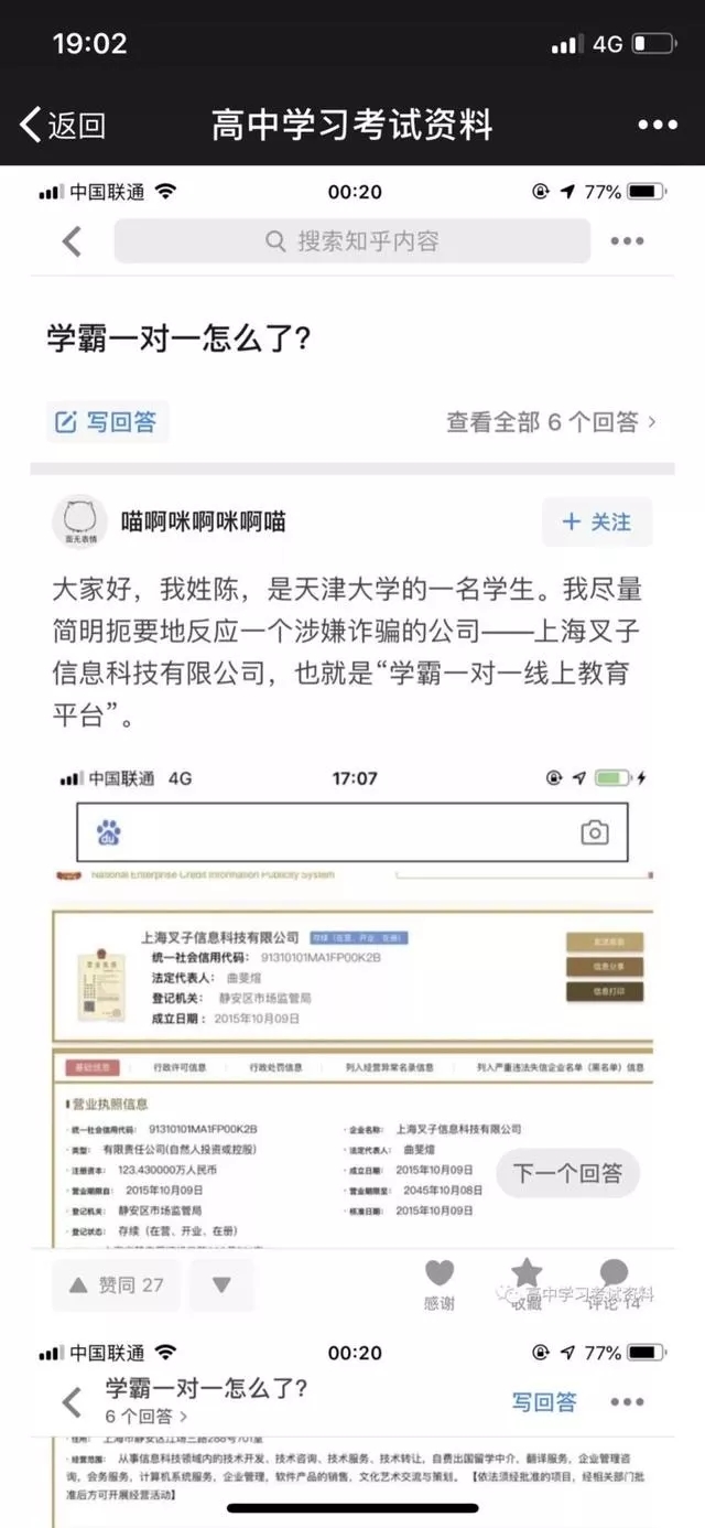 二:“学霸一对一”平台所属公司为上海叉子信息科技有限公司,法定代表人为曲斐煊,成立日期为2015年10月9日。而“学霸君一对一”平台为学霸君下属一对一在线教育平台,所属公司为上海谦问万答吧云计算科技有限公司,法定代表人为张凯磊,成立日期为2013年12月31日。二者之间无任何关联。