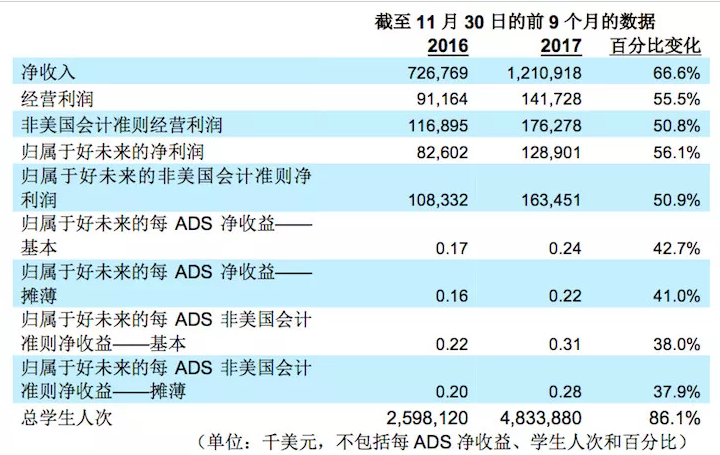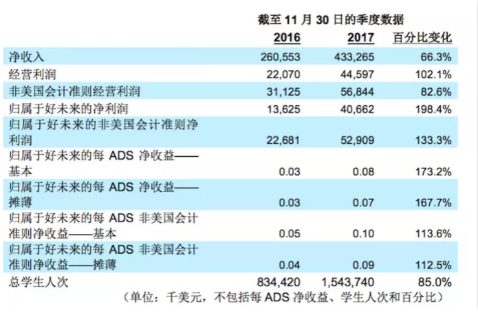 1月25日消息,北京时间今日下午,好未来公布了截至2017年11月30日的2018财年Q3未经审核的财务业绩。财报显示,好未来本财季净收入 4.333 亿美元,同比增长 66.3%。营收增长主要来自于学生人数的增长,Q3总学生人次超150万,同比增长85%。财报业绩如下:
