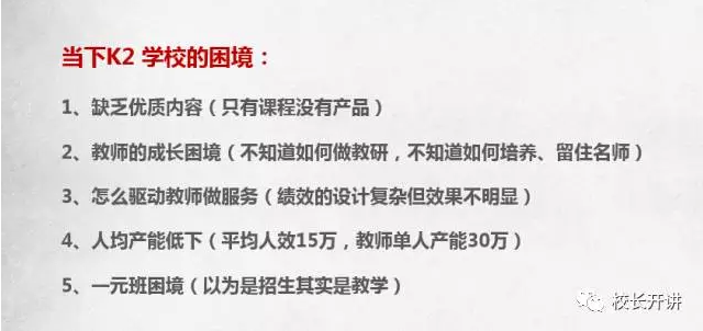 第一:缺乏优质内容,我们很多学校只有课程没有产品,教研能力薄弱,虽然今天其实都是同质化竞争,没有跟别的竞争对手在同一赛道的竞品拉开差距。