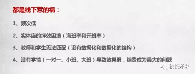 第二:坪效。实体店因为房租的压力、教师成本的上升,所以实体店的效绩也越来越难,导致今天的满班率、开班率都不够,这些都导致收入里边的利润结构比例非常的不合理。
