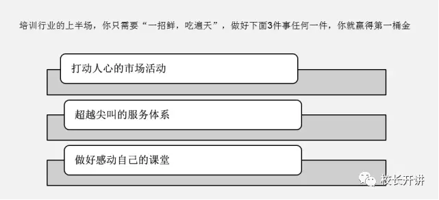 我们可以看到在2003到2013年这个十年里边,我们其实不用做什么的,我们叫一招鲜吃遍天,只是要做好下面三件事你就能赢得第一桶金,市场上有很多所谓的运营驱动型的学校,就是特别能做市场活动,有很多善于做服务的学校,有很多特别善于做产品的学校,在过去的十年里边,你只要在任何一点上爆发和突破,你都有机会获得十倍级的成长。