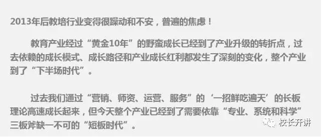 在今天2013年以后教育培训行业已经到了短板时代,你必须在营销、服务、产品和管理上都强,你才能够活到新的十年里边,才能在新的十年里边成为一个高成长的机构。