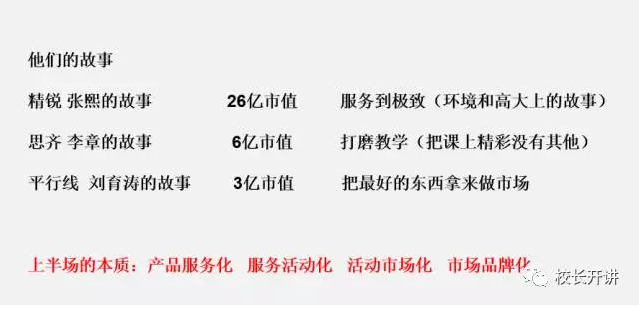 举例1:第一个就是上海的精锐教育,一对一的,精锐大概从零做到十个亿差不多就用了五年时间,他们就是用服务和环境来打动人,把服务、产品、人性化的环境做到了极致。