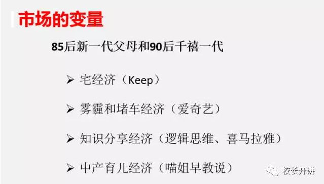 八五后这一代和九零后这一代他们有显著的特征,比如说宅经济,你会发现以前家长是愿意开车一个小时送孩子去学校的,现在觉得远了就越来越希望在社区、在家门口有学校,所以就要求你开始布点,以前可能在一个城市里面布了十个点就够了,但现在可能是每个小区、每个学区都要去布一个点。