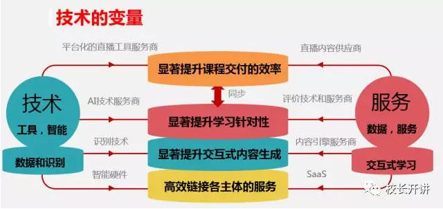 其中最大的变量就是技术变量,就是在13年大量的资金涌入互联网教育,使得互联网技术在教育行业里的应用得到了空前的发展。大家都知道前两天有个高考机器人考了一百三十四分,而像这样的AI技术、语义识别技术、手写识别技术、人脸识别技术,以及直播工具、内容引擎、学业评价服务,包括智能硬件,这些都在进入到教育行业里,这些都会形成新的运营模式和教学模式。
