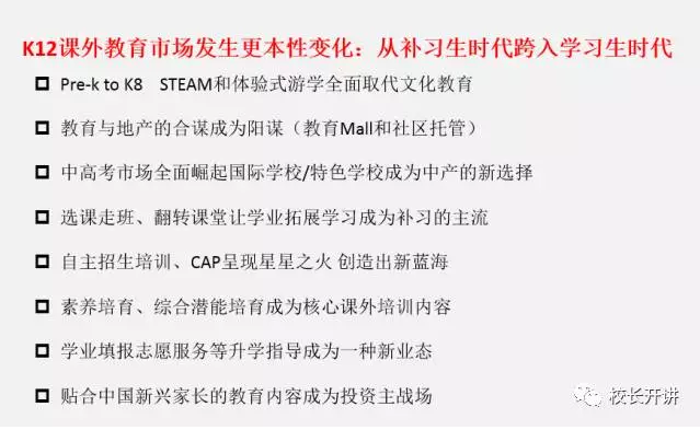 因为这次高考改革,导致初三、高三要开始所谓的“3+x”,那么选科走班翻转课堂,让学业拓展学习成为补习的主流,未来学生出来找课外补习,将以学业补习为主,而不是所谓知识点补习,如何让学生能够适应翻转课堂,如何让学生去适应选科走班,如何让学生去做学业规划都成为新的教育增长点。