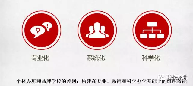 只有三个点,第一个就是专业化,第二个叫系统化,第三个科学化。个体办班、个体办学和品牌学校的差别就是在这三个点上,因为只有专业系统和科学基础上,才能实现组织的效率,才能把能效比增加起来。