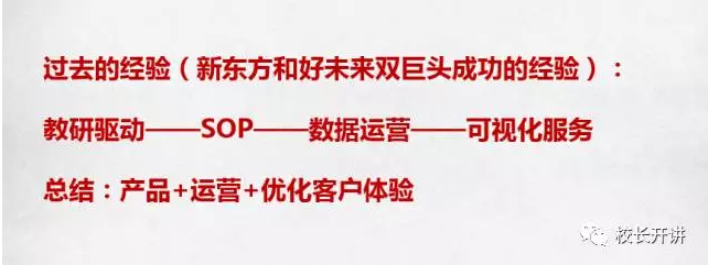 在过去的三年时间里边,都在数据运算干的非常的出色。我们知道好未来、新东方,用数据来发现问题、用数据去优化运营,基础都在与数据化体验,因为今天我们要面临的是八五后、九零后的家长零零后的学生,这些学生都有强有力的自驱力,而这种自驱力最好的办法就是把服务可视化、进步可视化,所以在过去的两三年里我们总结一下,两巨头跨入百亿,不是没有道理的,他们在产品运营和客户体验优化上都下了长足的工作,两家机构在这方面的投入都不少于两到三亿人民币。