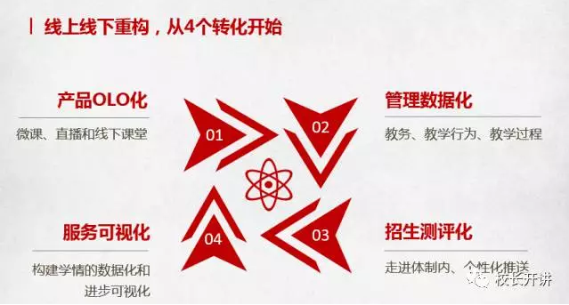 第一个叫重塑,学校的本质是教研。教育的本质是产品,所以我们说课程不是产品,产品包含了课程,以及所覆盖的服务。