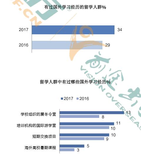 34% 的受访者表示在准备留学前已有过海外学习的经历,这一数据在一年时间内上涨了 5%。报告认为,此类人群是目前整体留学市场增长的主要驱动力。