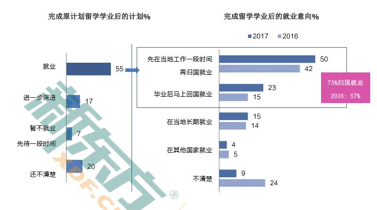 教育部数据显示,2016年中国留学生人数已达54万。而随着中国综合国力的提升,国内经济的迅速发展带来了更多就业机会,更多学生愿意归国就业——73%的留学人群计划完成学业后归国就业。不少留学人群愿意在当地工作一段时间后回国就业,希望海外工作经验对未来就业有帮助。