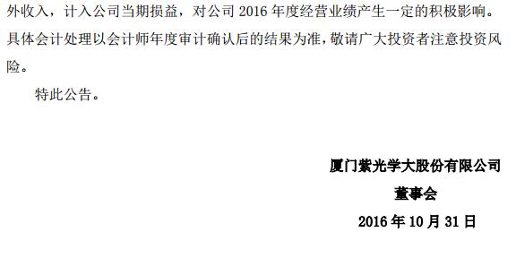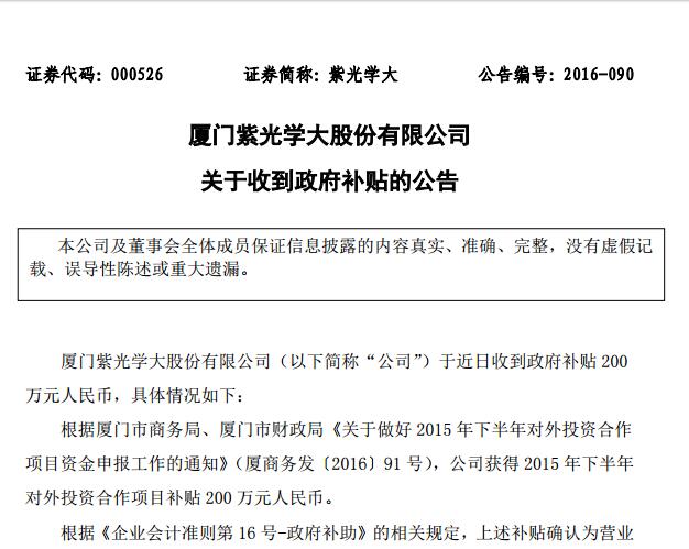 紫光学大关于收到政府补贴的公告