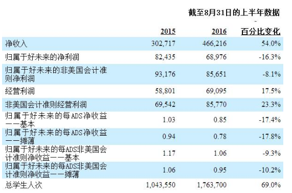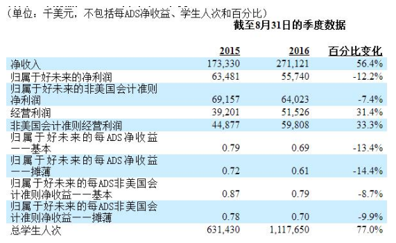 10月27日消息,好未来今日发布截至2016年8月31日未经审计的2017财年Q2财报。财报显示,好未来2017财年Q2总营收2.71亿美元,同比增长56.4%,净利润5574万美元,同比下降12.2%;2017财年上半年总营收4.66亿美元,同比增长54.0%;净利润6898万美元,同比下降16.3%。